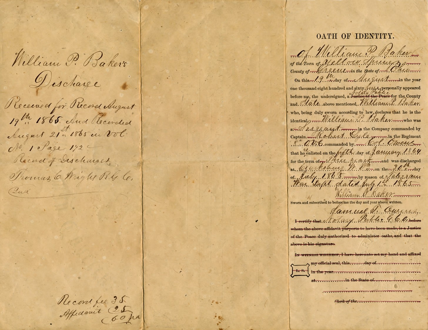 William Penn Baker (age 22) enlisted for a period of three years on September 5, 1861, as a Private in Co. D, 44th Ohio Infantry, and mustered out on January 4, 1864. He was then transferred as a veteran to Co. M, 8th Ohio Volunteer Cavalry. He was take prisoner and held at Libby Prison, near Richmond, VA.
