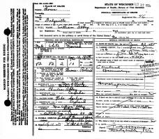 - Mary Maude Abbey: Born December 10, 1881, in the Town of Orion, Richland Co., WI; Died September 30, 1986, at Pine Ridge Manor, Waupaca, Waupaca Co., WI (age 104). Buried in Eastside Cemetery, Dodgeville, Iowa Co., WI. Married August 12, 1903, at the Methodist Episcopal Church, Dodgeville, Iowa Co., WI, to George Washington Stratman: Born October 3, 1876, in the Village of Dodgeville, Iowa Co., WI; Died November 24, 1918, in Monroe, Green Co., WI (age 42). Buried in Eastside Cemetery, Dodgeville, Iowa Co., WI.