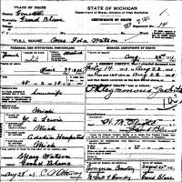 Grand Blanc, Mich., Aug. 31. - Mrs. George Watson died at her home on the Pollock road August 22 of stomach trouble, from which she has been suffering for some time. Mrs. Watson, who was formerly Miss Ida Lewis, was the daughter of Mr. and Mrs. F. A. Lewis, and was born in Grand Blanc in 1867. She was married to George Watson in 1884. Besides her husband, she is survived by three children, William, of Barker, N. Y., Mamie and Theodore, at home, her parents, who reside in Mt. Morris, and one sister, Mrs. Albert O'Hara, of Flint. The funeral was held at the home Friday morning and burial was made in Whigville cemetery.