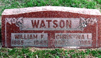 - William F. Watson: Born May, 1885, in Grand Blanc, Genesee Co., MI ; Died February 1, 1945, in Flint, Genesee Co., MI (age 59) . Buried in Evergreen Cemetery (a/k/a Whigville Cemetery) , Grand Blanc, Genesee Co., MI. Married March 18, 1908, in Niagara Co., NY, to Christina L. Huntington: Born December 25, 1887, in New York; Died September 6, 1965, in Flint, Genesee Co., MI (age 77). Buried in Evergreen Cemetery (a/k/a Whigville Cemetery) , Grand Blanc, Genesee Co., MI.